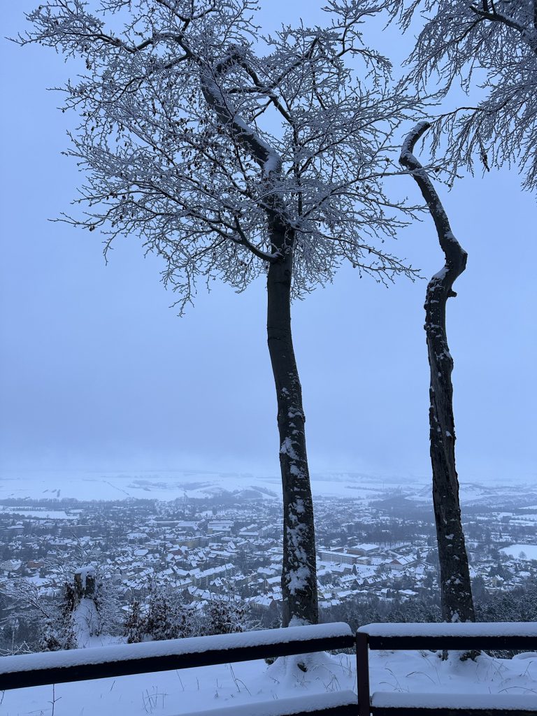 Natürlich musste ich den Schnee ausnutzen und eine Wanderung durch den Wald zu meinem „Ort der Stille“ machen. Knirschender Schnee unter den Füßen und Bäume, die aussahen, als hätte jemand sie liebevoll mit Puderzucker bestäubt führte mich der Weg hinauf auf die Klippen – und dort wartete ein Ausblick, der mich einfach immer wieder sprachlos macht: die verschneite Stadt unter mir. Der Schnee hatte einen ganz besonderen Zauber an den Bäumen hinterlassen, so filigran und fast märchenhaft. Zum Glück habe ich noch ein gutes Auge für die Wunder der Natur. Auf Fotos lässt sich die wahre Schönheit der Natur nämlich kaum einfangen.